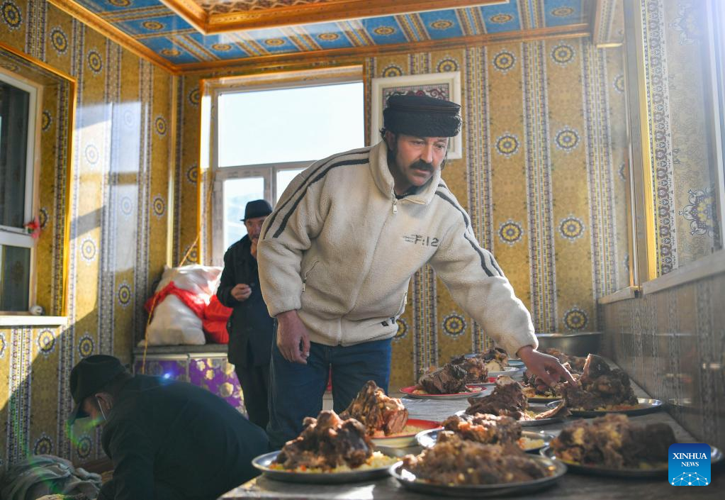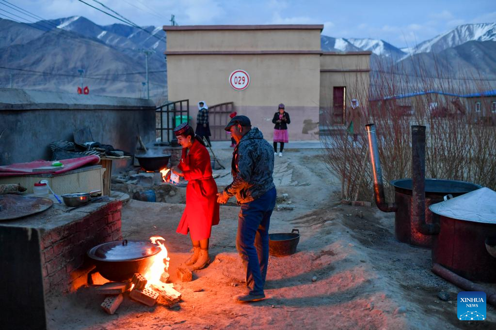An elder of Mairmaitih Tirmur's family prepares food for relatives and friends at home in Taxkorgan Tajik Autonomous County, northwest China's Xinjiang Uygur Autonomous Region, March 19, 2023. In Taxkorgan Tajik Autonomous County, many young men and women prefer to get married in the spring season.