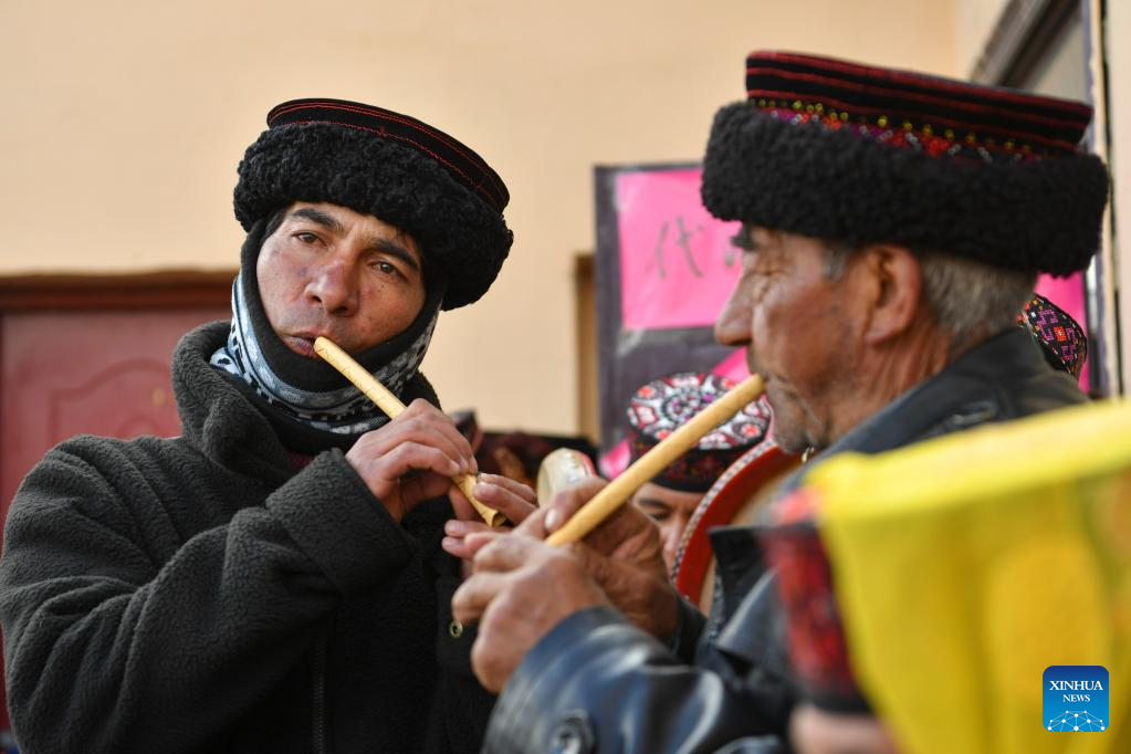 Relatives of Gulihan Jrbli play music instruments in front of the bride's home in Taxkorgan Tajik Autonomous County, northwest China's Xinjiang Uygur Autonomous Region, March 18, 2023. In Taxkorgan Tajik Autonomous County, many young men and women prefer to get married in the spring season.