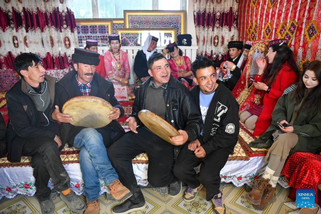 Relatives and friends sing loudly at the wedding ceremony to send blessings to the new couple in Taxkorgan Tajik Autonomous County, northwest China's Xinjiang Uygur Autonomous Region, March 19, 2023. In Taxkorgan Tajik Autonomous County, many young men and women prefer to get married in the spring season.