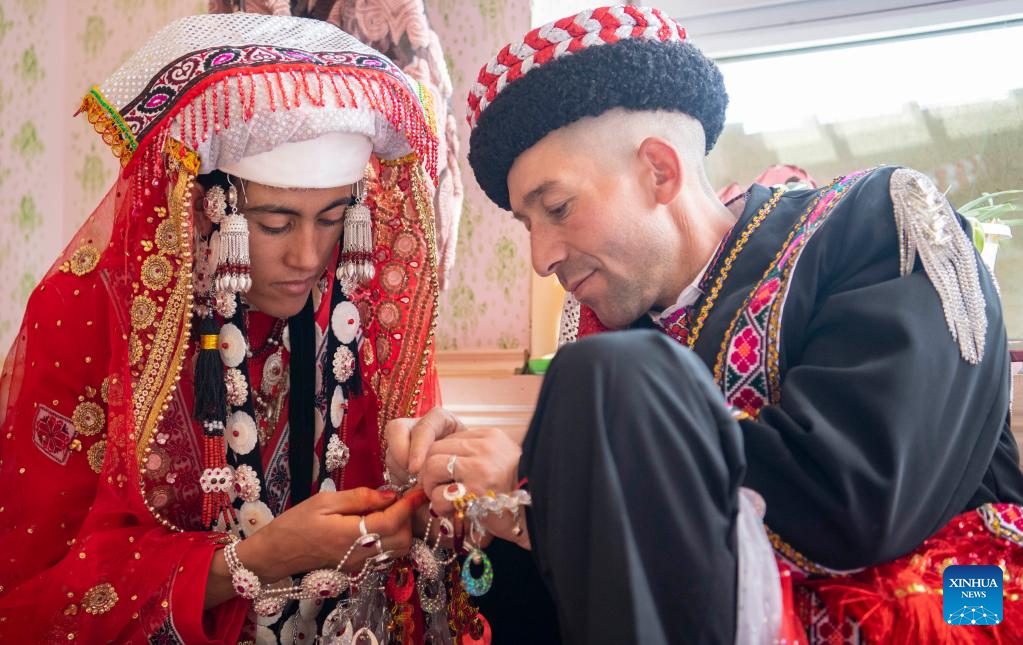 Mairmaitih Tirmur helps his bride Gulihan Jrbli arrange ornaments on her hands at their new home in Taxkorgan Tajik Autonomous County, northwest China's Xinjiang Uygur Autonomous Region, March 20, 2023. In Taxkorgan Tajik Autonomous County, many young men and women prefer to get married in the spring season.