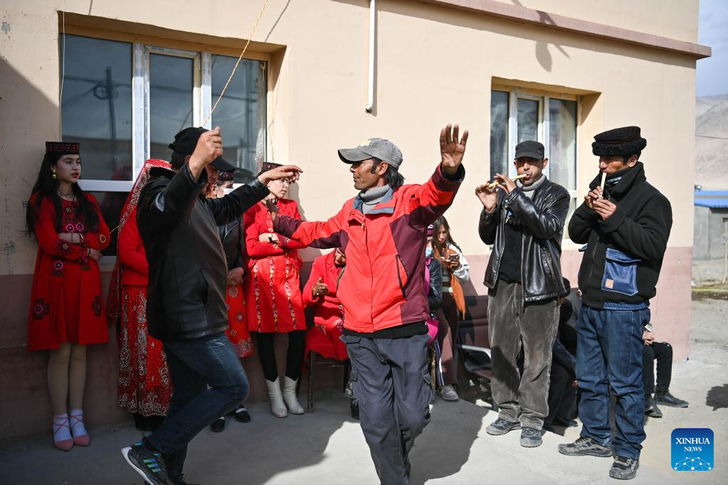 Relatives of Gulihan Jrbli play music instruments and dance in front of the bride's home in Taxkorgan Tajik Autonomous County, northwest China's Xinjiang Uygur Autonomous Region, March 18, 2023. In Taxkorgan Tajik Autonomous County, many young men and women prefer to get married in the spring season.