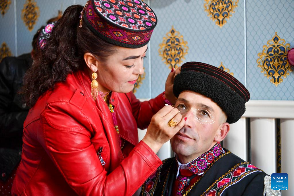 A relative applies makeup around the eyes of the groom Mairmaitih Tirmur before the wedding in Taxkorgan Tajik Autonomous County, northwest China's Xinjiang Uygur Autonomous Region, March 19, 2023. In Taxkorgan Tajik Autonomous County, many young men and women prefer to get married in the spring season.