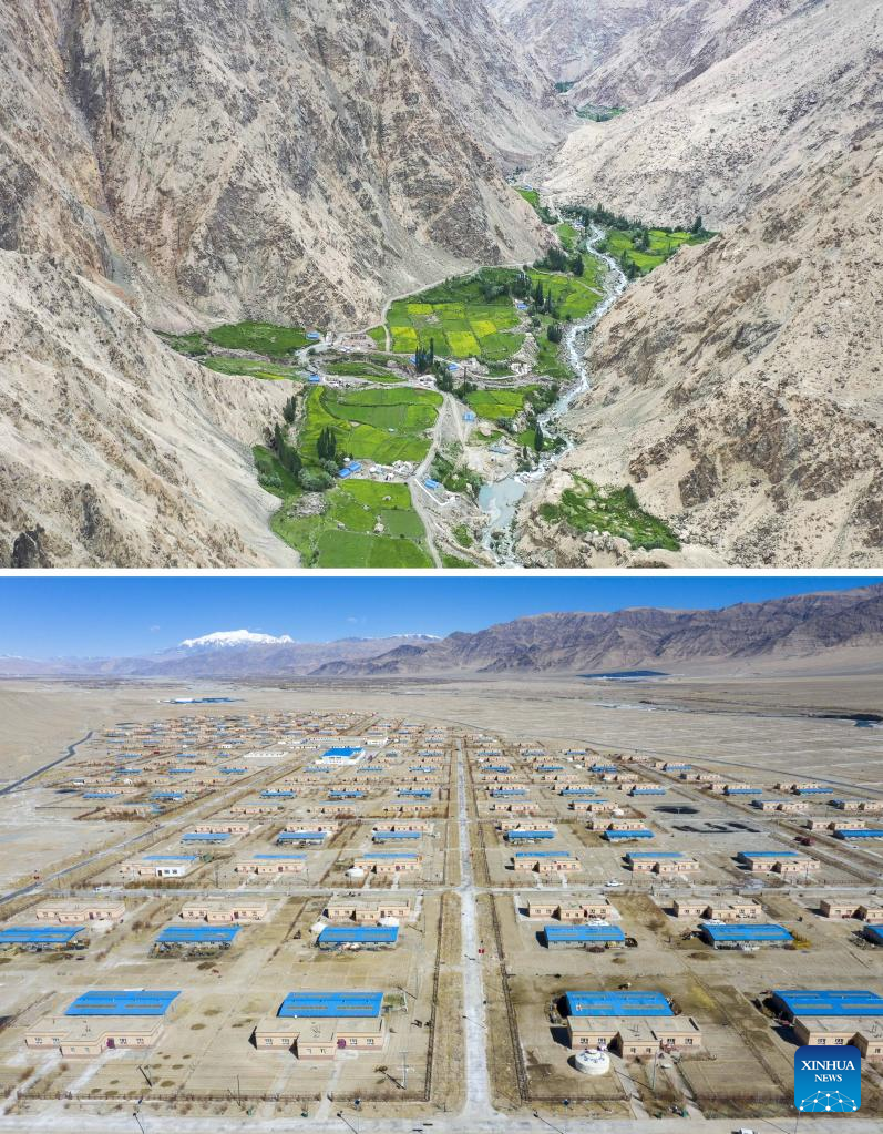 The upper part of the combo photo taken on June 28, 2019 shows an aerial view of Maryang Township, where Gulihan Jrbli and her family used to live before relocation; and the lower part of the combo photo taken on March 17, 2023 shows an aerial view of Fumin Village and Aimin Village, where Gulihan and her family live after resettlement, in Taxkorgan Tajik Autonomous County, northwest China's Xinjiang Uygur Autonomous Region. In Taxkorgan Tajik Autonomous County, many young men and women prefer to get married in the spring season.