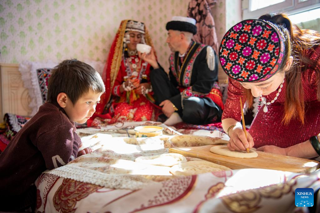 Groom Mairmaitih Tirmur's sister makes naan bread for the newlywed couple as a blessing in Taxkorgan Tajik Autonomous County, northwest China's Xinjiang Uygur Autonomous Region, March 20, 2023. In Taxkorgan Tajik Autonomous County, many young men and women prefer to get married in the spring season.