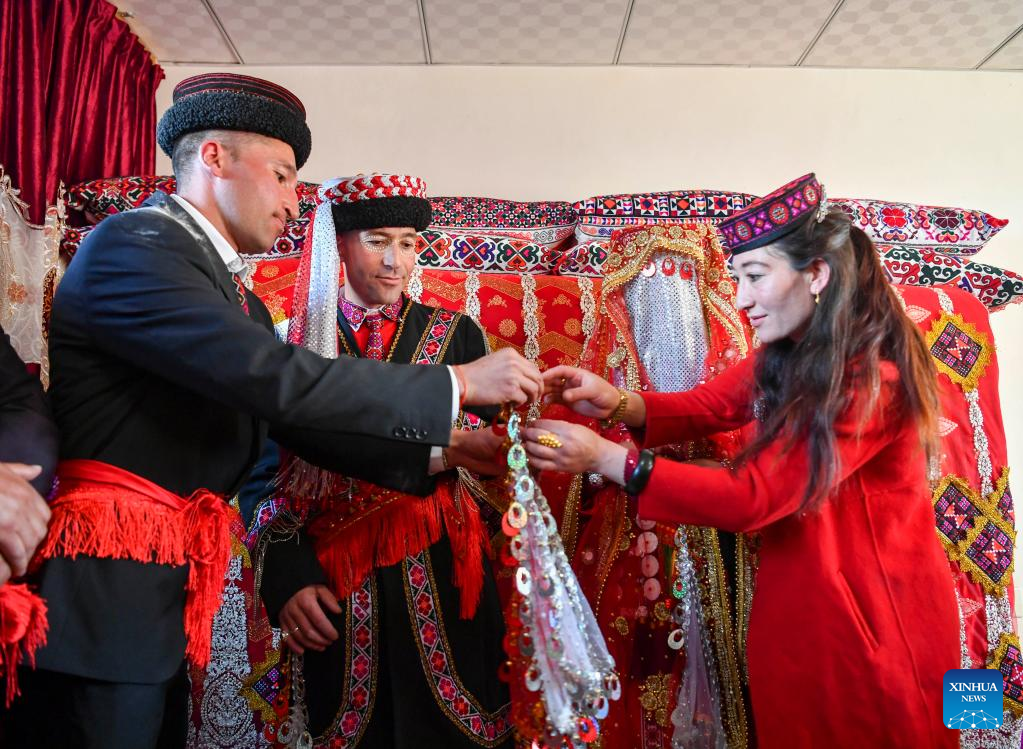 Relatives and friends (1st L and 1st R) help the bride and groom exchange rings with traditional decorations in Taxkorgan Tajik Autonomous County, northwest China's Xinjiang Uygur Autonomous Region, March 19, 2023. In Taxkorgan Tajik Autonomous County, many young men and women prefer to get married in the spring season.
