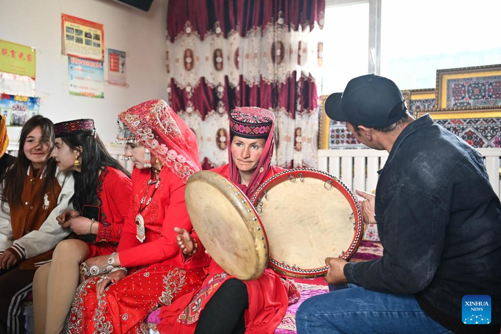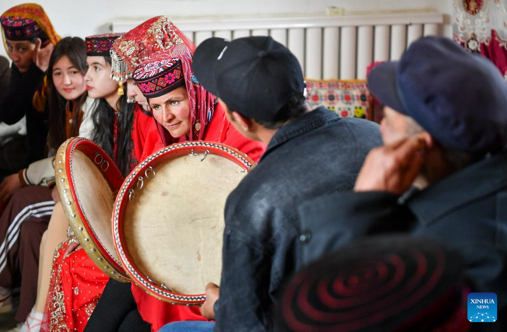 Relatives and friends of the bride Gulihan Jrbli play tambourines and sing at her home in Taxkorgan Tajik Autonomous County, northwest China's Xinjiang Uygur Autonomous Region, March 18, 2023. In Taxkorgan Tajik Autonomous County, many young men and women prefer to get married in the spring season.
