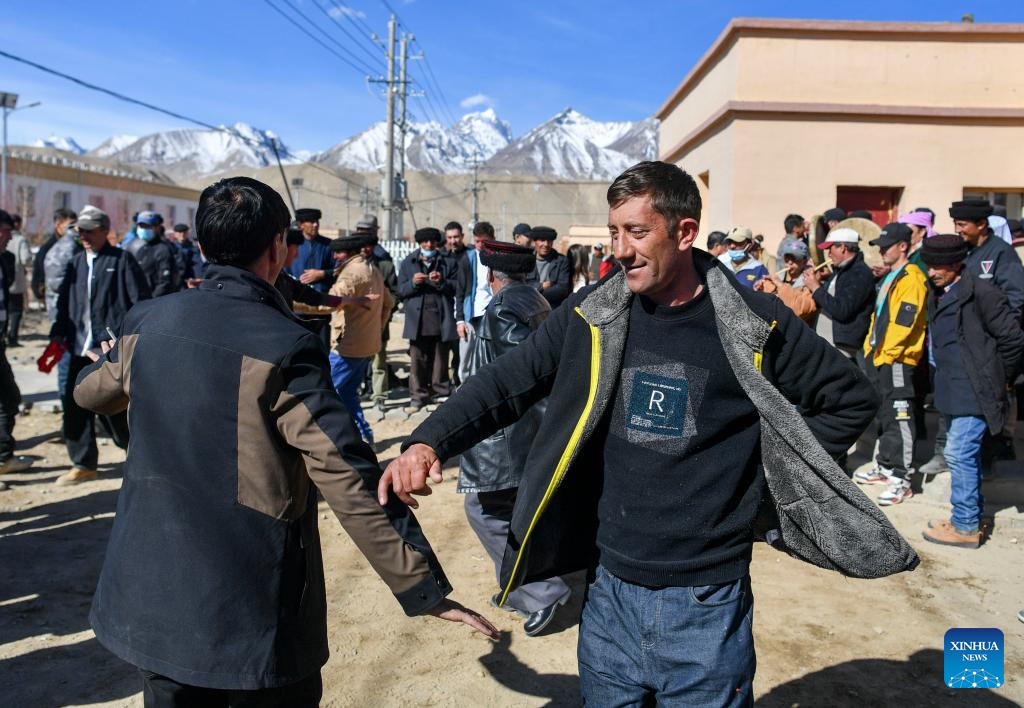 Relatives greet each other with a typical Tajik gesture -- grasping each others' hands and kissing the others' knuckles, in front of bride Gulihan Jrbli's home in Taxkorgan Tajik Autonomous County, northwest China's Xinjiang Uygur Autonomous Region, March 18, 2023. In Taxkorgan Tajik Autonomous County, many young men and women prefer to get married in the spring season.