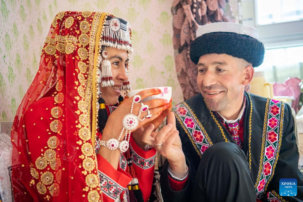 Recently in Fumin Village, 25-year-old Gulihan Jrbli and her groom Mairmaitih Tirmur held a wedding after falling in love for more than three years. The ceremony was conducted according to traditional Tajik wedding custom, with relatives, friends and villagers singing and dancing to celebrate.