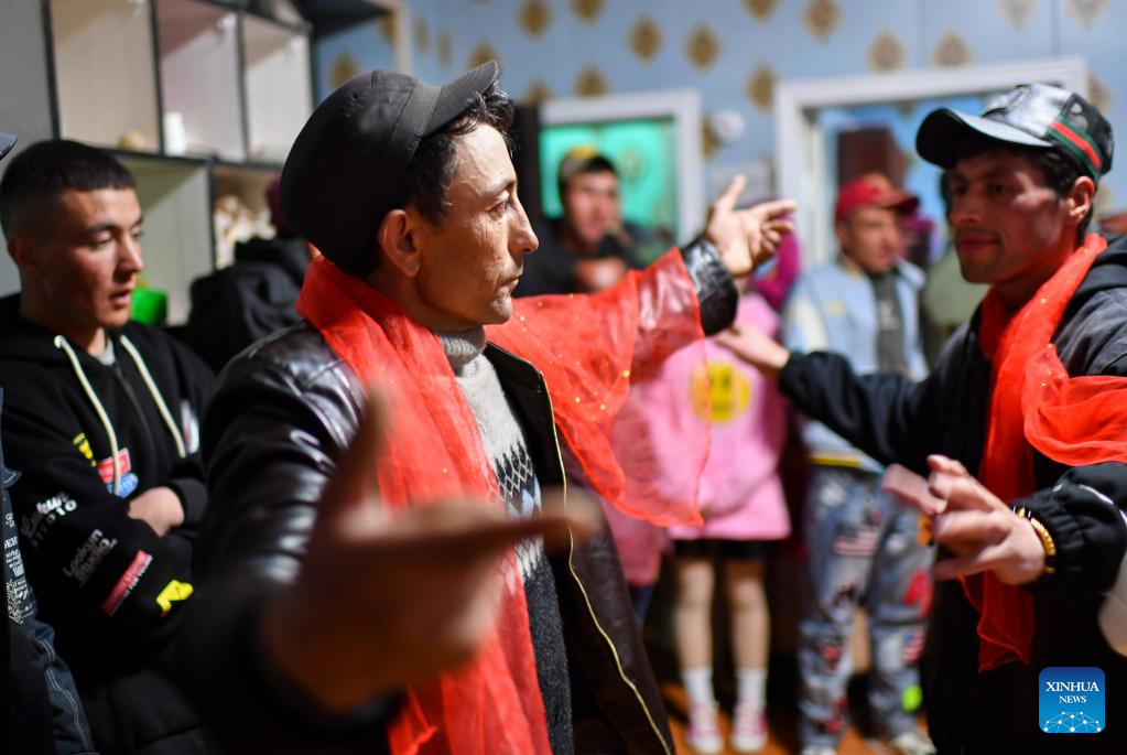 Groom Mairmaitih Tirmur's relatives dance at his home in Taxkorgan Tajik Autonomous County, northwest China's Xinjiang Uygur Autonomous Region, March 18, 2023. In Taxkorgan Tajik Autonomous County, many young men and women prefer to get married in the spring season.