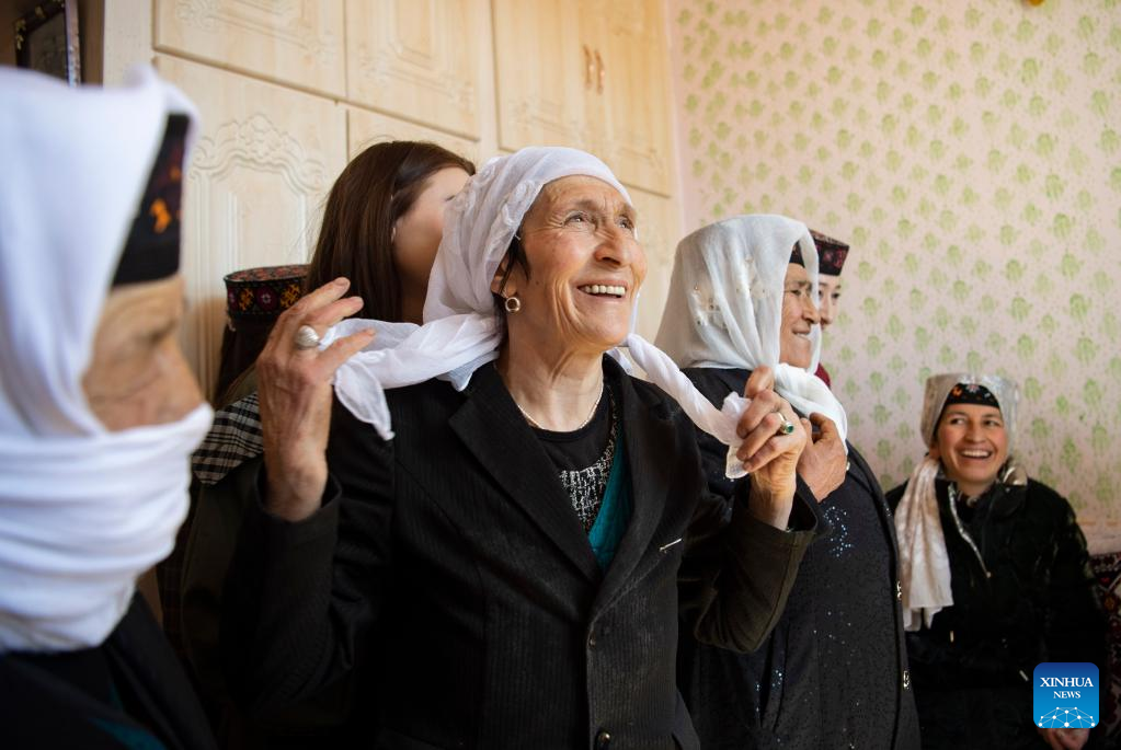 Groom Mairmaitih Tirmur's mother and relatives are pictured at the couple's new home in Taxkorgan Tajik Autonomous County, northwest China's Xinjiang Uygur Autonomous Region, March 20, 2023. In Taxkorgan Tajik Autonomous County, many young men and women prefer to get married in the spring season.