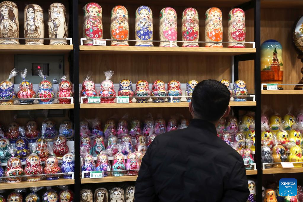 A customer shops for matryoshka dolls at a Russian goods store in Manzhouli, north China's Inner Mongolia Autonomous Region, March 16, 2023. Popularity of Russian goods and foods has revived among local customers after the land port of Manzhouli resumes services. (Xinhua/Wang Kaiyan)