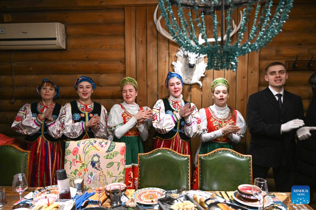Russian waiters stage a performance at a Russian restaurant in Manzhouli, north China's Inner Mongolia Autonomous Region, March 15, 2023. Popularity of Russian goods and foods has revived among local customers after the land port of Manzhouli resumes services. (Xinhua/Bei He)