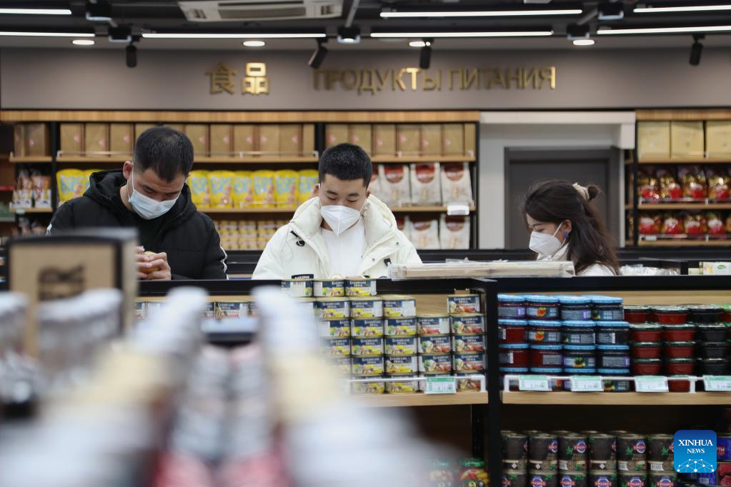 People shop at a Russian goods store in Manzhouli, north China's Inner Mongolia Autonomous Region, March 16, 2023. Popularity of Russian goods and foods has revived among local customers after the land port of Manzhouli resumes services. (Xinhua/Wang Kaiyan)