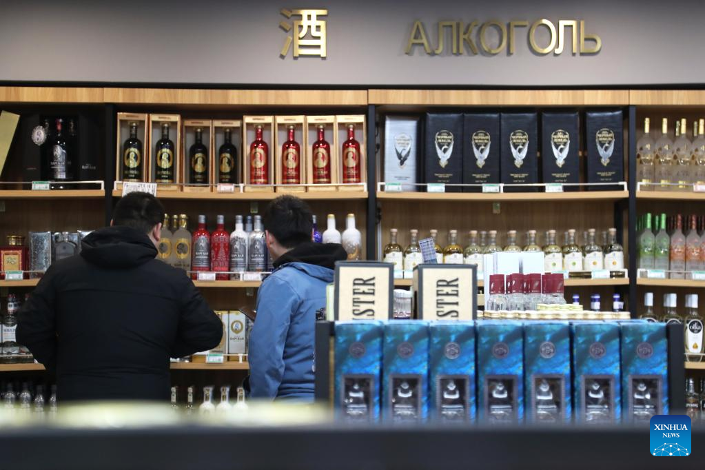 People shop for liquor at a Russian goods store in Manzhouli, north China's Inner Mongolia Autonomous Region, March 16, 2023. Popularity of Russian goods and foods has revived among local customers after the land port of Manzhouli resumes services. (Xinhua/Wang Kaiyan)