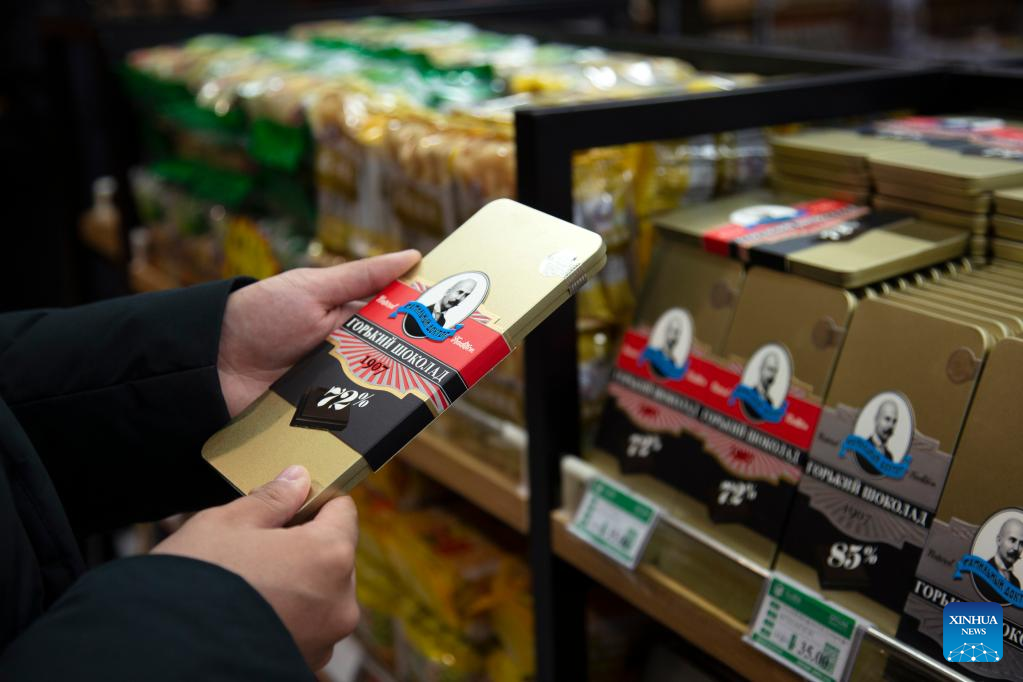 A customer shops for chocolates at a Russian goods store in Manzhouli, north China's Inner Mongolia Autonomous Region, March 16, 2023. Popularity of Russian goods and foods has revived among local customers after the land port of Manzhouli resumes services. (Xinhua/Wang Kaiyan)