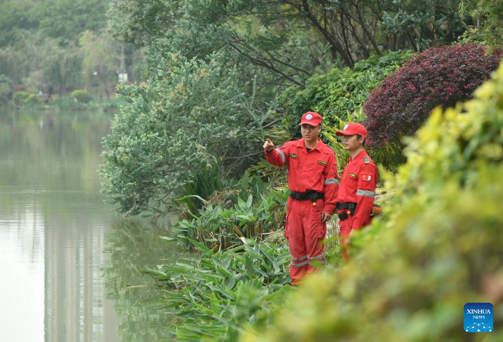 Members of an urban waterway system management team patrol the north section of Liuhua Creek in Fuzhou, southeast China's Fujian Province, March 21, 2023.