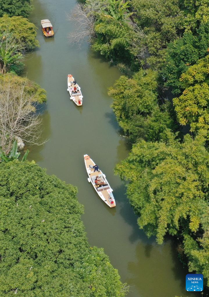 This aerial photo taken on Feb. 25, 2023 shows tourists taking a boat ride along the Baima River in Fuzhou, southeast China's Fujian Province.