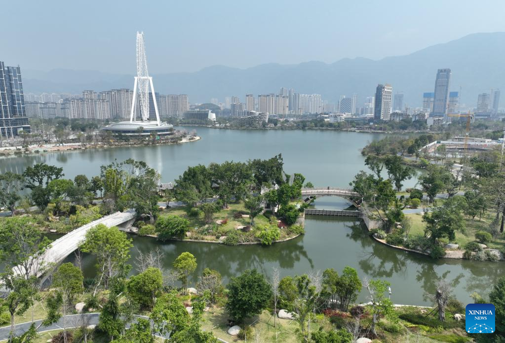 This aerial photo taken on March 22, 2023 shows a view of Jin'an Park, an ecological corridor in downtown Fuzhou, southeast China's Fujian Province.