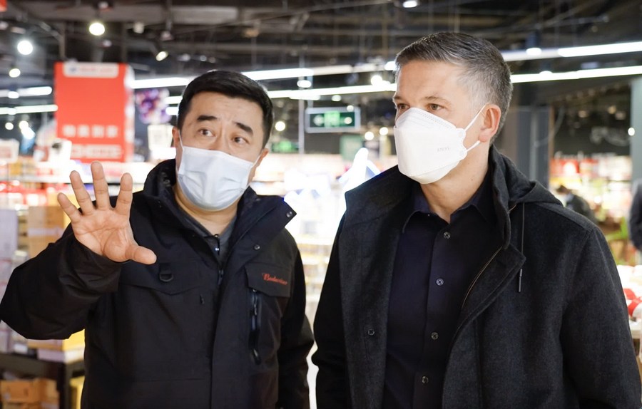Michel Doukeris (R), chief executive of Anheuser-Busch InBev, visits a market in Beijing, capital of China, Feb. 23, 2023. (Xinhua)