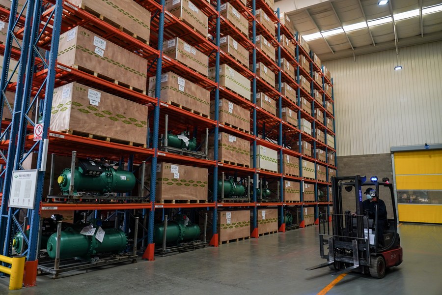 This photo taken on Feb. 27, 2023 shows the warehouse of Bitzer Refrigeration Technology (China) Co., Ltd. in Beijing, capital of China. (Xinhua/Peng Ziyang)