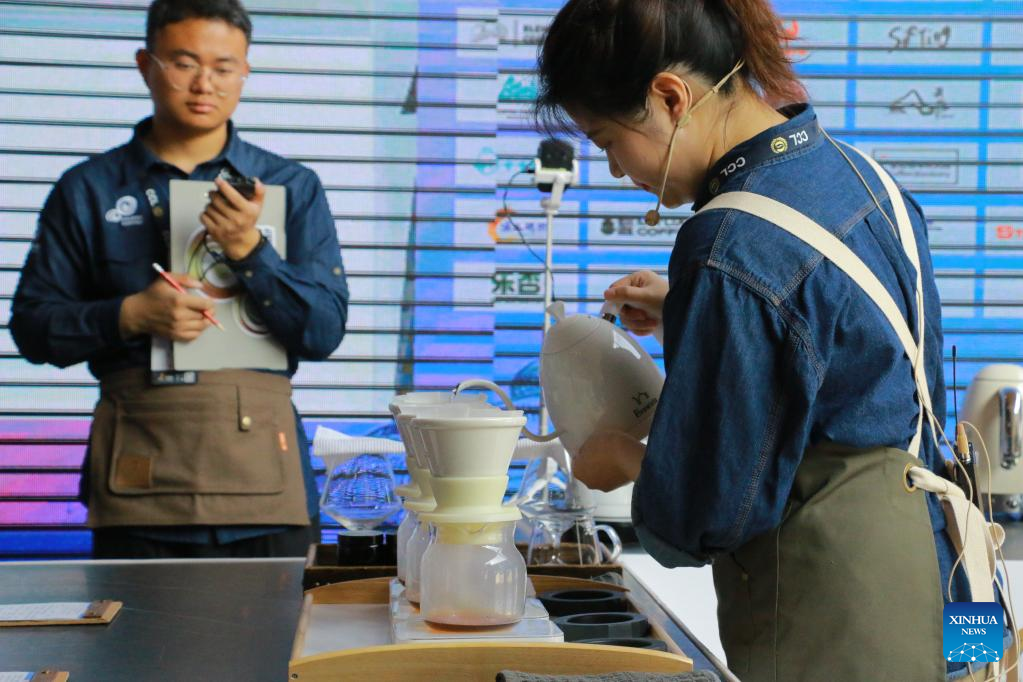 A woman participates in a competition at the 8th China Coffee Brewers Cup in Baoshan, southwest China's Yunnan Province, March 16, 2023. (Xinhua)