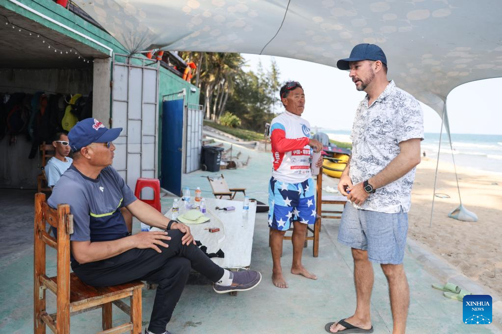 Alexander Pantyukhin (1st R) chats with friends in Boao, south China's Hainan Province, March 18, 2023. Alexander Pantyukhin, a Russian living in Boao town of Hainan, is a surfing brand entrepreneur.