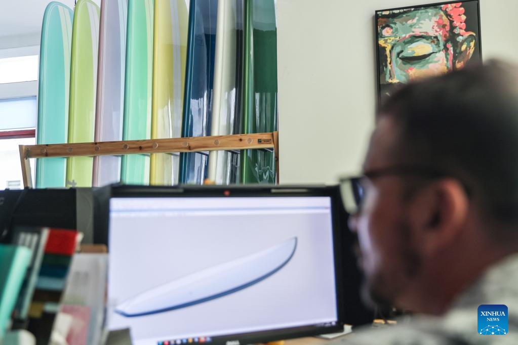 Alexander Pantyukhin designs a surfboard in his shop in Boao, south China's Hainan Province, March 18, 2023. Alexander Pantyukhin, a Russian living in Boao town of Hainan, is a surfing brand entrepreneur.