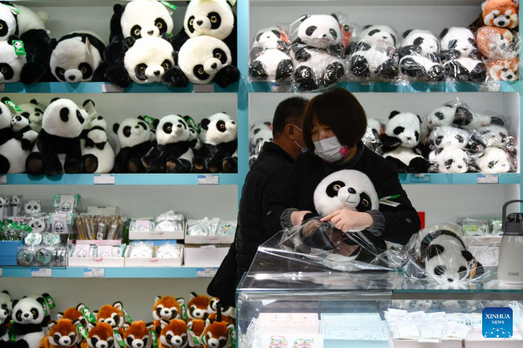 A staff member packs souvenir panda plush toys for customers at Chengdu Research Base of Giant Panda Breeding in Chengdu, southwest China's Sichuan Province, March 22, 2023. (Xinhua/Xu Bingjie)