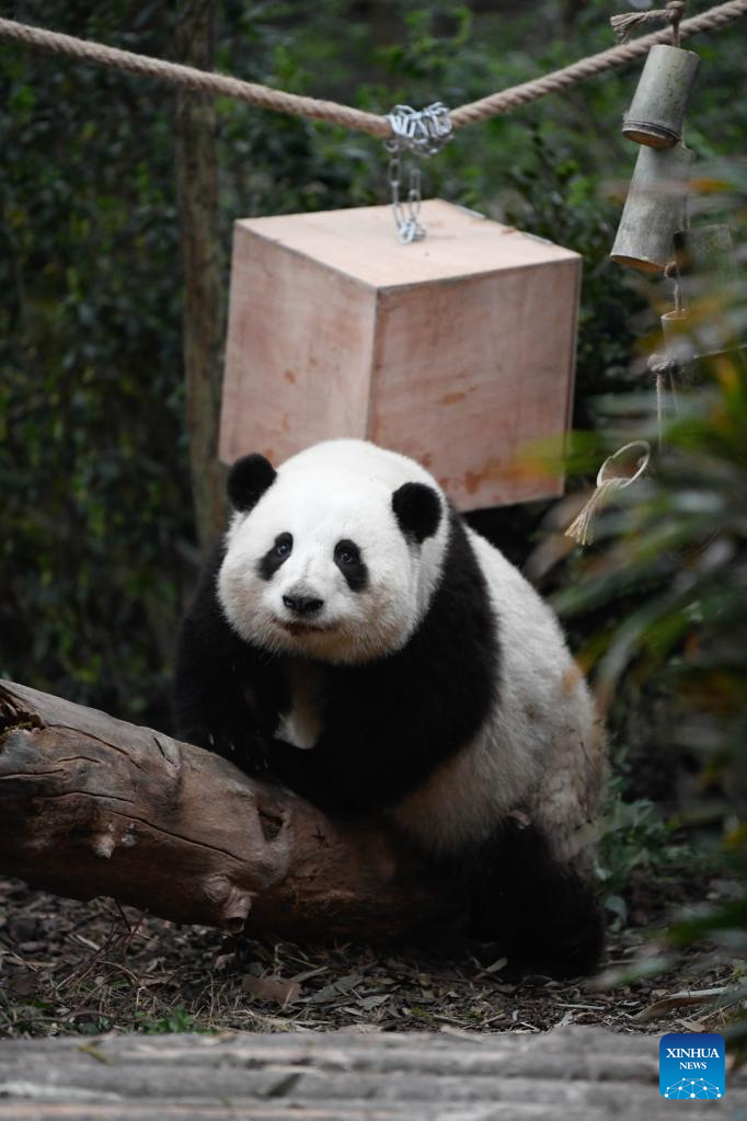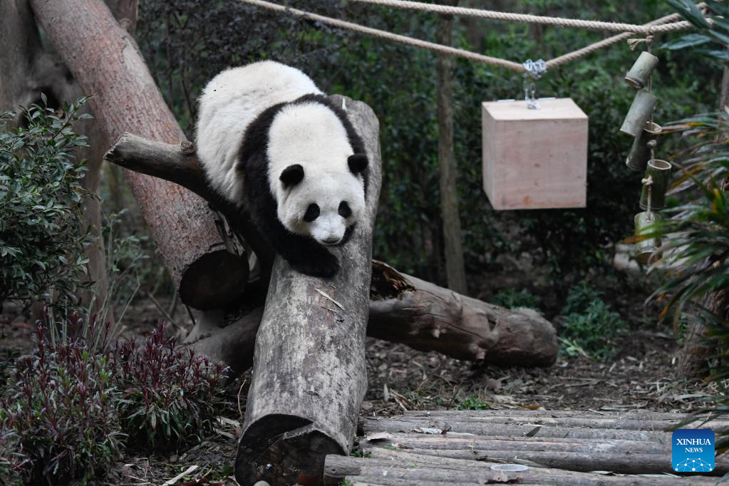 Giant panda He Hua plays at Chengdu Research Base of Giant Panda Breeding in Chengdu, southwest China's Sichuan Province, March 22, 2023. (Xinhua/Xu Bingjie)