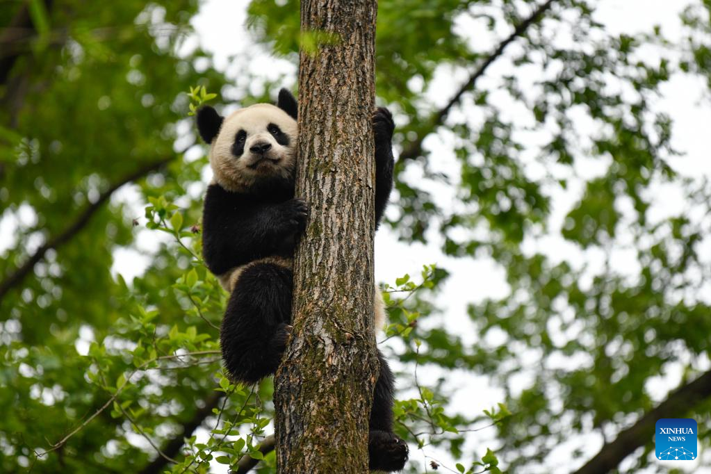 Giant panda Jin Xiao climbs up a tree at Chengdu Research Base of Giant Panda Breeding in Chengdu, southwest China's Sichuan Province, March 22, 2023. (Xinhua/Xu Bingjie)