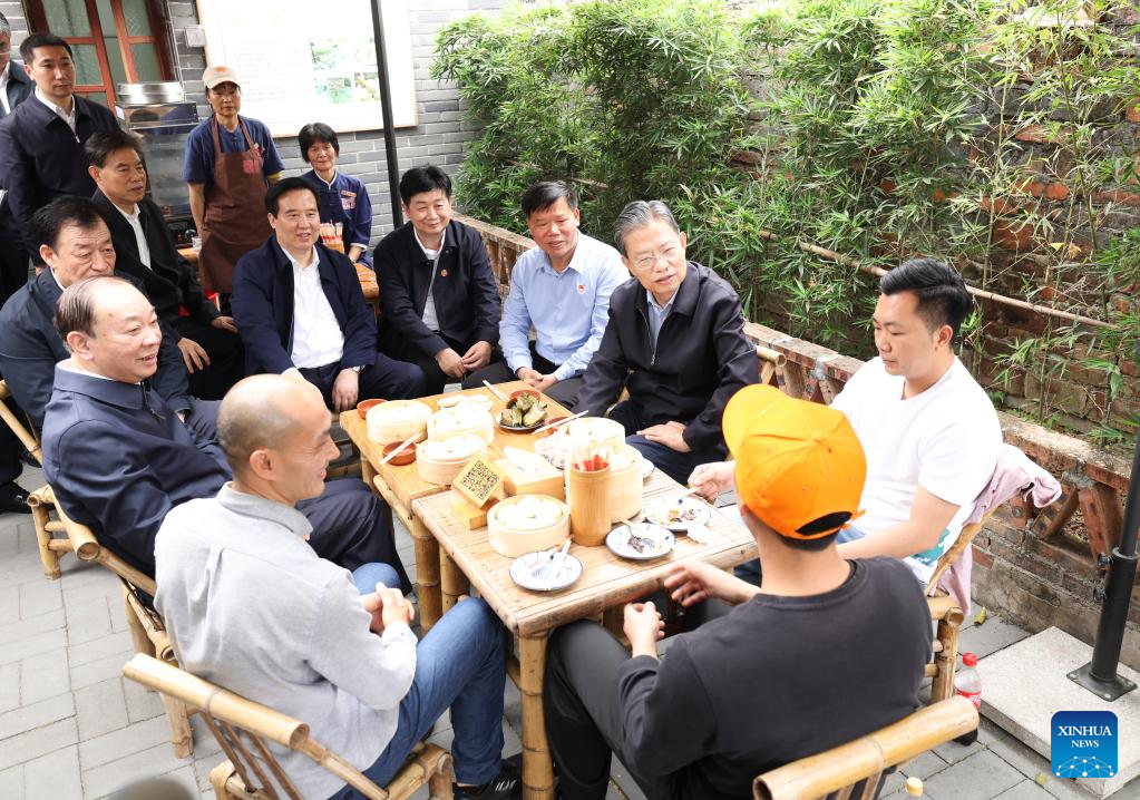 Zhao Leji, a member of the Standing Committee of the Political Bureau of the Communist Party of China (CPC) Central Committee and chairman of the Standing Committee of the National People's Congress (NPC), talks with deputies to people's congresses at grassroots level in Wanzai Subdistrict of Xiangzhou District in Zhuhai, south China's Guangdong Province, March 21, 2023. Zhao made an inspection tour of the southern Guangdong Province from Tuesday to Friday. (Xinhua/Pang Xinglei)