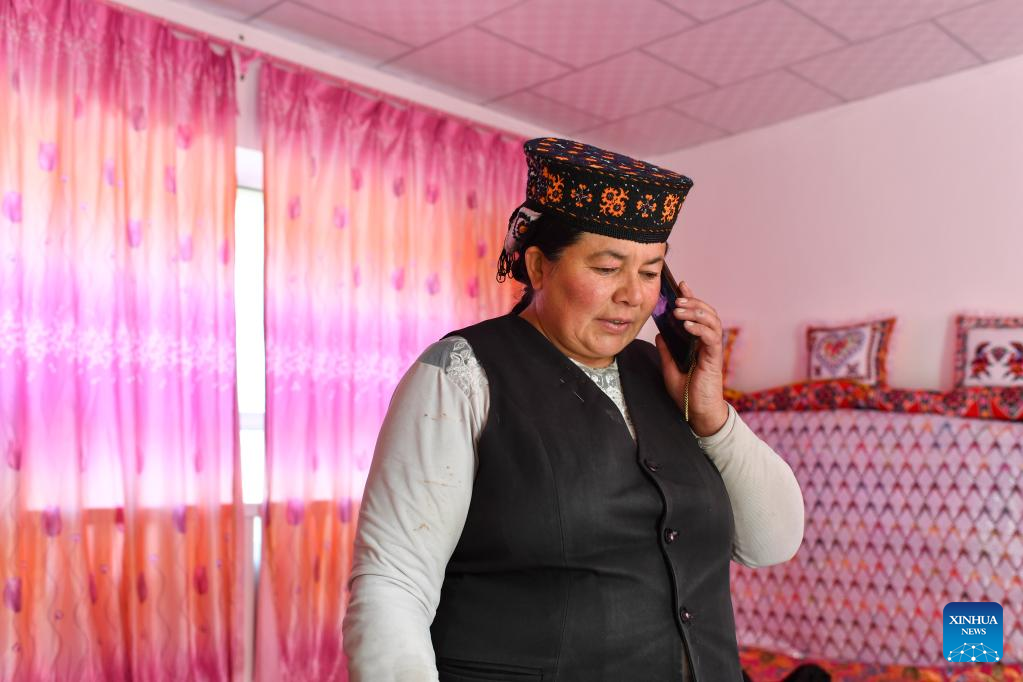 Nanik Kukan gives a phone call to her busband Duri Jarman in Aimin Village of Taxkorgan Tajik Autonomous County, northwest China's Xinjiang Uygur Autonomous Region, Nov. 25, 2019. Before the relocation, she had to go to the township government if she wants to call her relatives.