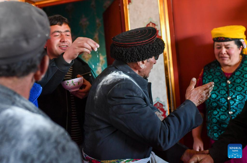 Nurkerim Duri, youngest son of Duri Jarman, applies flour on visiors' shoulders as a traditional means of blessing in Aimin Village of Taxkorgan Tajik Autonomous County, northwest China's Xinjiang Uygur Autonomous Region, March 21, 2023.