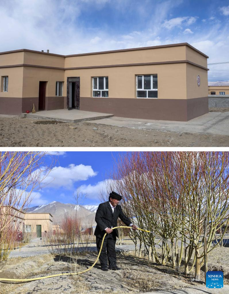 This combo photo shows the exterior view of Duri Jarman's new house upon his relocation in Aimin Village of Taxkorgan Tajik Autonomous County on Nov. 18, 2018 (above) and Duri Jarman watering willows in his yard on March 21, 2023.