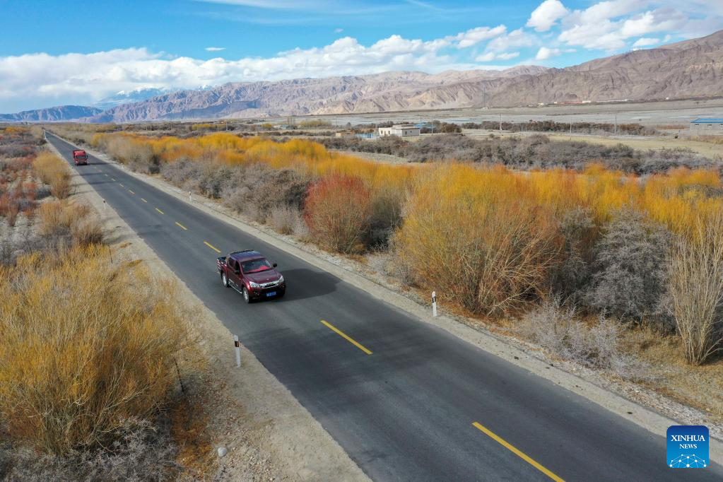 This areial photo taken on March 19, 2023 shows Nurkerim Duri driving back to Aimin Village after replenishing shop stock in Taxkorgan Tajik Autonomous County, northwest China's Xinjiang Uygur Autonomous Region.