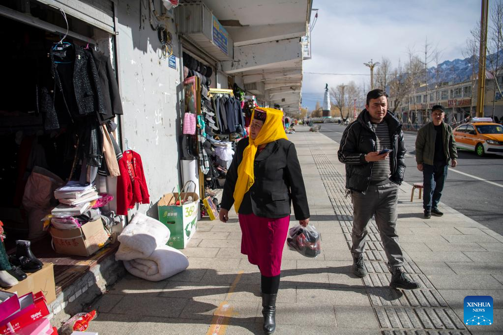 Nurkerim Duri (C) and his mother Nanik Kukan (L) shop for daily necessities in the downtown area of Taxkorgan Tajik Autonomous County, northwest China's Xinjiang Uygur Autonomous Region, March 19, 2023. Before their relocation in Aimin Village, Nanik seldom visited the county due to inconvenient transportation.