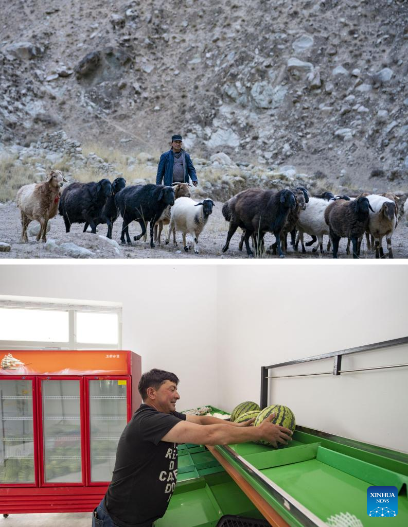 This combo photo shows Duri Jarman herding before relocation in the mountains of Taxkorgan Tajik Autonomous County on Nov. 16, 2018 (above) and arranging watermelons for selling at his store in Aimin Village on June 24, 2020.