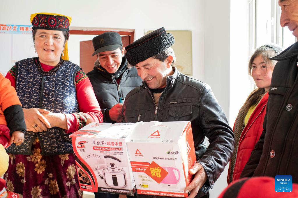 Neighbors offer their blessings as Duri Jarman relocates to his new home in Aimin Village of Taxkorgan Tajik Autonomous County, northwest China's Xinjiang Uygur Autonomous Region, Nov. 18, 2018.