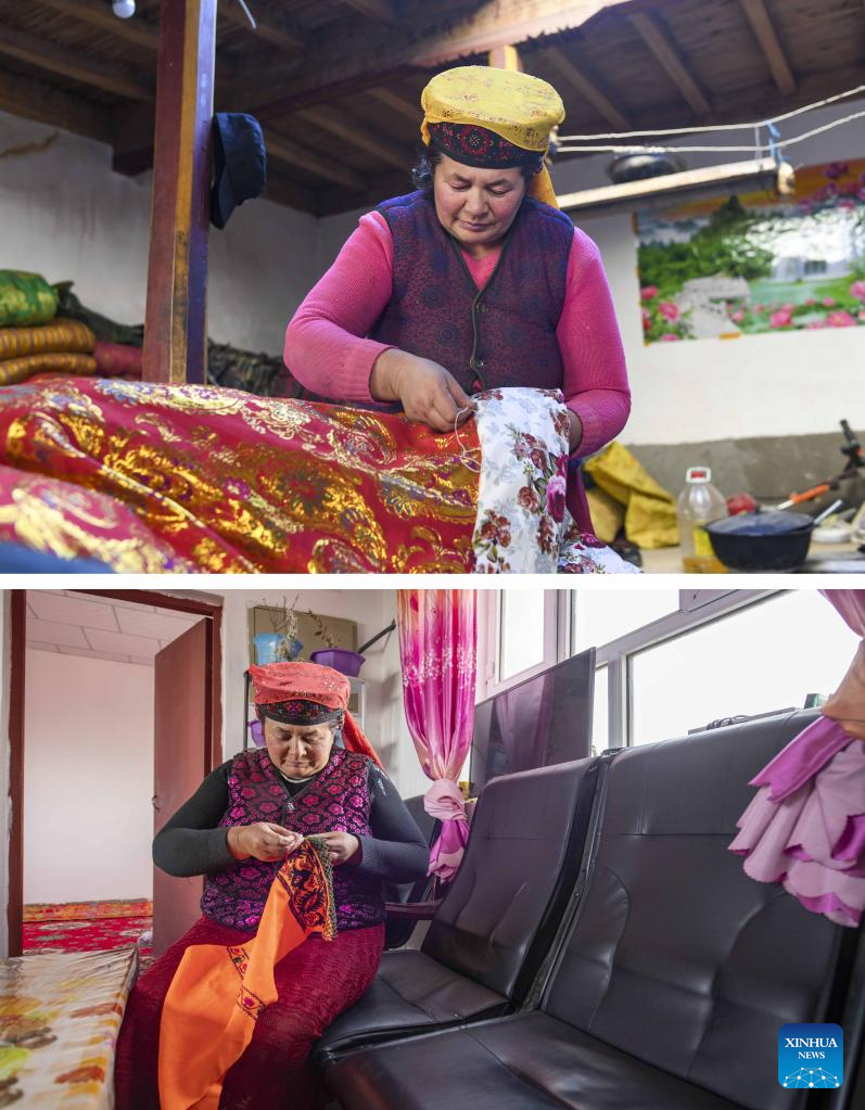 This combo photo shows Nanik Kukan, wife of Duri Jarman, sewing clothes for their relocation in Ak Toga Langar Village deep in the mountains of Taxkorgan Tajik Autonomous County on Nov. 13, 2018 (above) and making hand embroidery at her new home in Aimin Village on June 3, 2020. The life of herdsman Duri Jarman is closely tied to two places: the village of Ak Toga Langar, nestled deep in the mountains of Taxkorgan Tajik Autonomous County, and Aimin Village, located near the county seat.