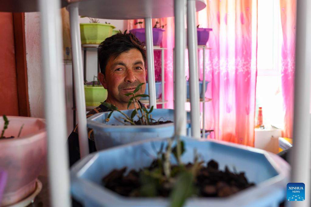 Duri Jarman checks dendrobium officinale planted at his home in Aimin Village of Taxkorgan Tajik Autonomous County, northwest China's Xinjiang Uygur Autonomous Region, June 26, 2019.