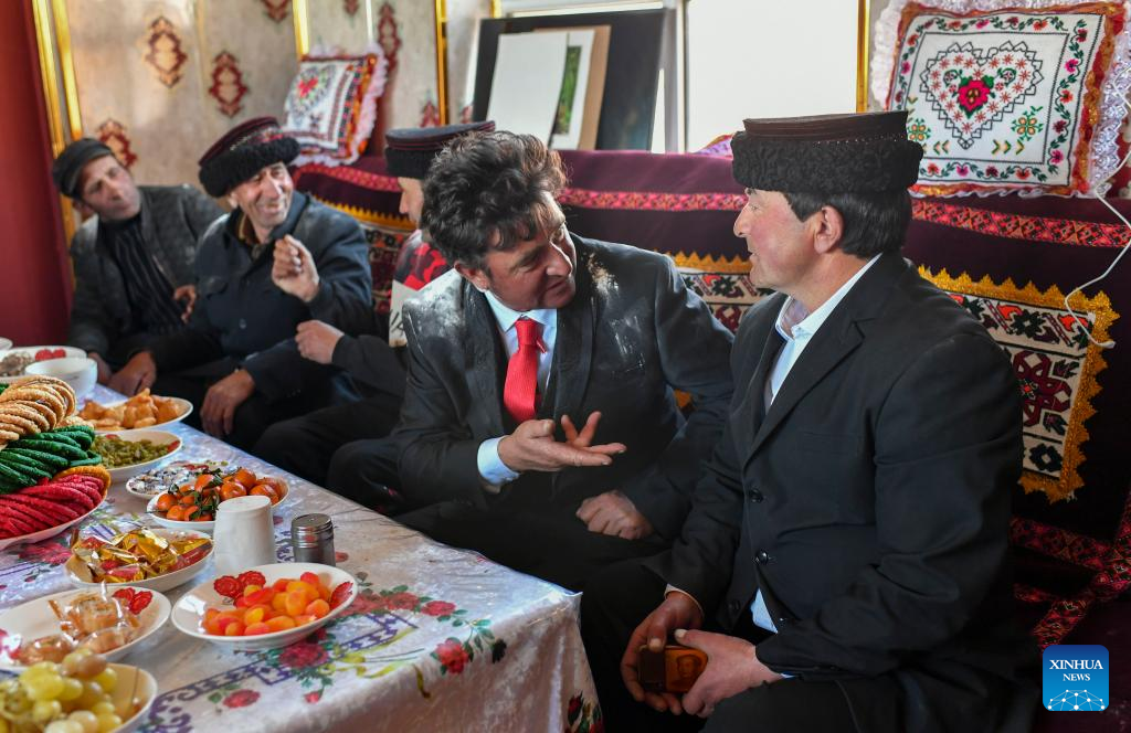 Duri Jarman (1st R) talks with friends at his home in Aimin Village of Taxkorgan Tajik Autonomous County, northwest China's Xinjiang Uygur Autonomous Region, March 21, 2023.
