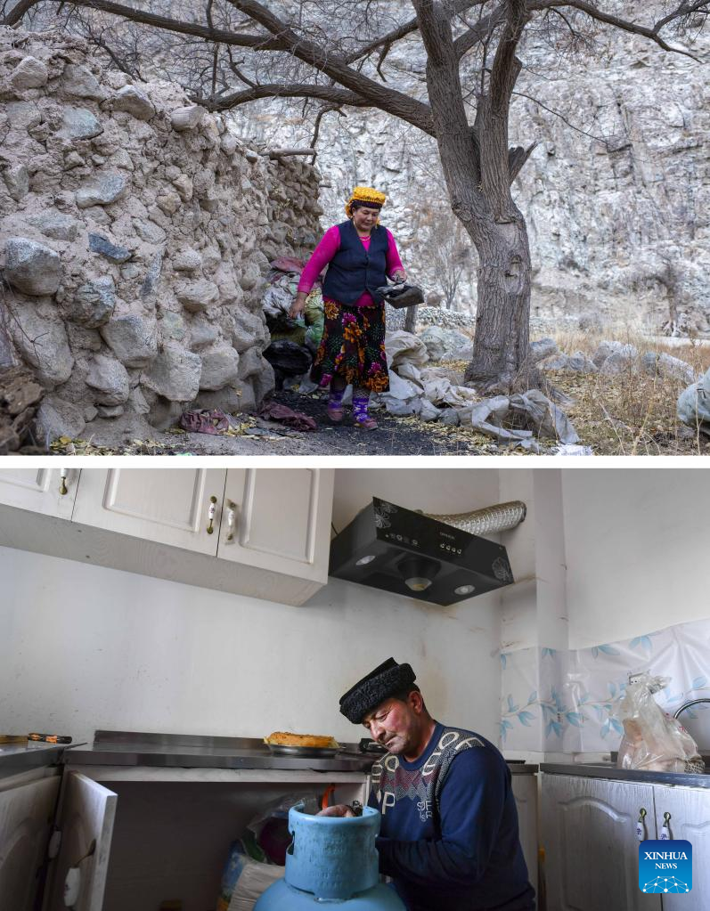 This combo photo shows Nanik Kukan, wife of Duri Jarman, fetching coal for cooking in Ak Toga Langar Village deep in the mountains of Taxkorgan Tajik Autonomous County on Nov. 16, 2018 (above) and Duri Jarman repairing liquid gas storage tank at his new home in Aimin Village on June 3, 2020.