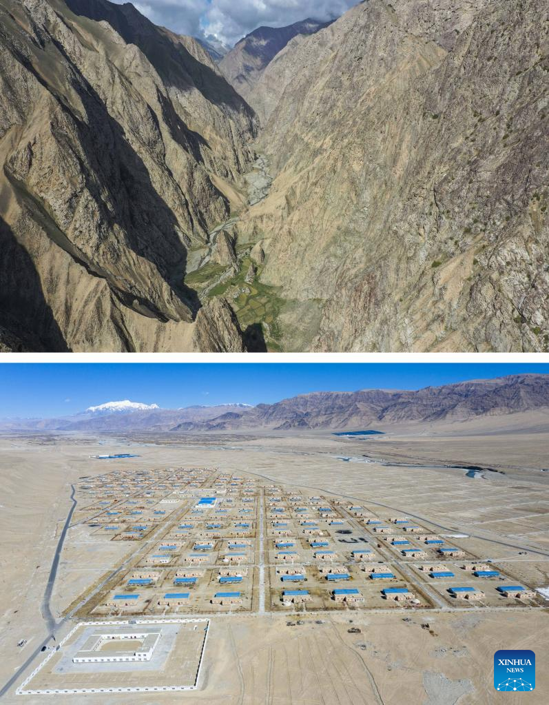 This aerial combo photo shows the valley where Duri Jarman and his family used to live before relocation in Ak Toga Langar Village deep in the mountains of Taxkorgan Tajik Autonomous County on June 20, 2019 (above) and the view of the resettlement area in Aimin Village where they live now on March 17, 2023.