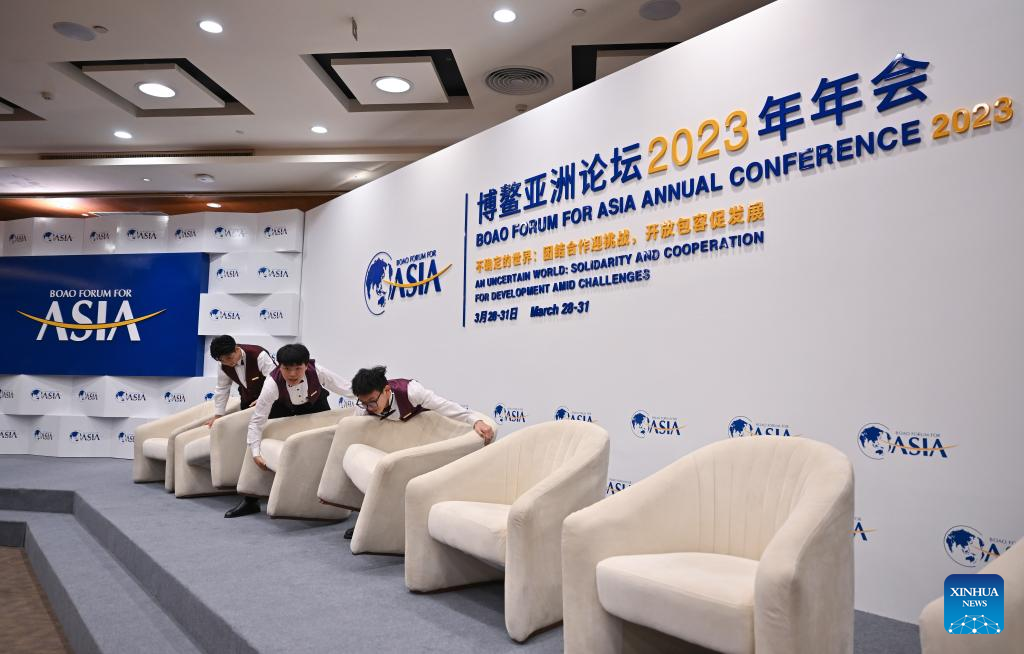 Staff members make preparation at a venue for a subforum of the Boao Forum for Asia (BFA) Annual Conference 2023 in Boao, south China's Hainan Province, March 24, 2023. The BFA will hold its annual conference from March 28 to 31 in Boao, a coastal town in China's island province of Hainan. (Xinhua/Guo Cheng)