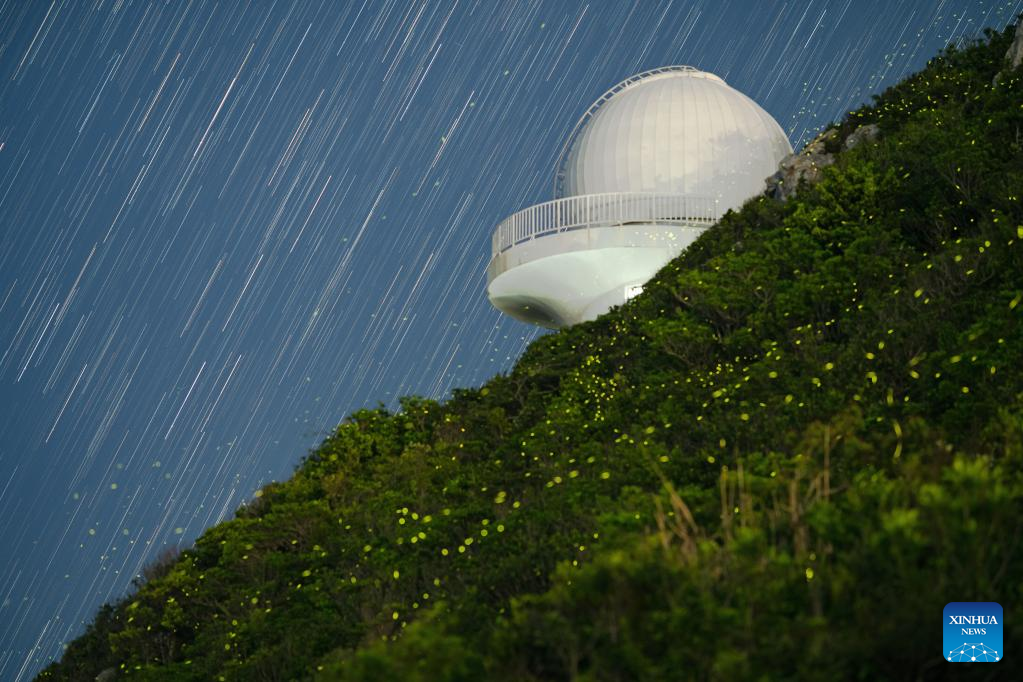 This photomontage taken on July 7, 2021 shows the Shenzhen Astronomical Observatory and flying fireflies in Shenzhen, south China's Guangdong Province. Certified by the International Dark-Sky Association (IDA), Xichong community in Shenzhen, south china's Guangdong Province, has become an International Dark Sky Community in China.