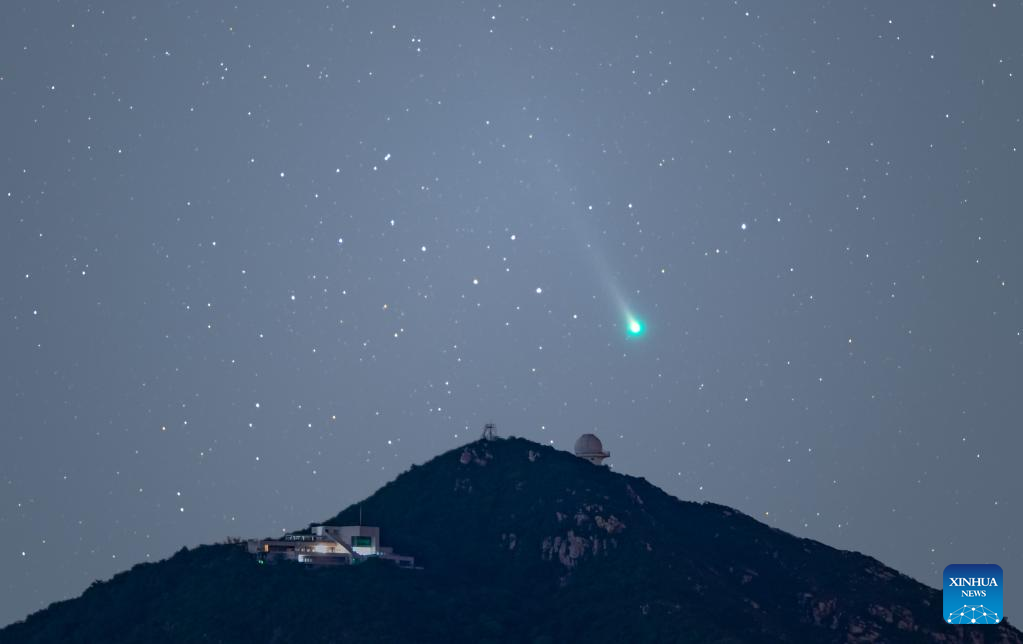 This photomontage taken on Dec. 7, 2021 shows a comet streaking across the night sky over Shenzhen, south China's Guangdong Province. Certified by the International Dark-Sky Association (IDA), Xichong community in Shenzhen, south china's Guangdong Province, has become an International Dark Sky Community in China.