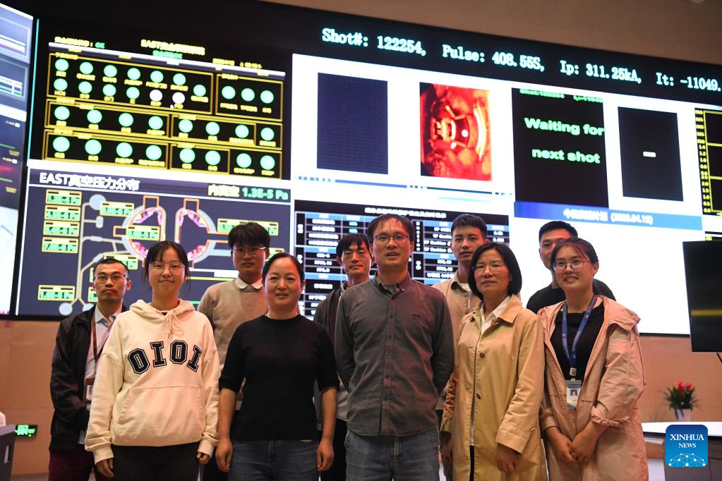 Researchers pose for a group photo after the success of an experiment at the control center of the experimental advanced superconducting tokamak (EAST) in Hefei, east China's Anhui Province, April 12, 2023.