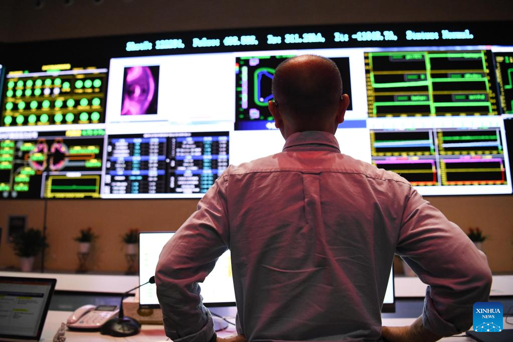 The experimental advanced superconducting tokamak (EAST), or the Chinese "artificial sun," achieved a steady-state high confinement plasma operation for 403 seconds on Wednesday, a key step toward the development of a fusion reactor. (Xinhua/Huang Bohan)