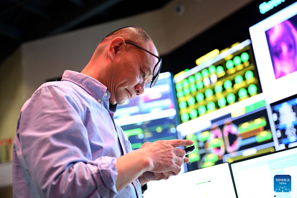 Gong Xianzu, a researcher at the Institute of Plasma Physics of the Chinese Academy of Sciences (ASIPP) who is in charge of an experiment in the steady-state high confinement plasma operation of the experimental advanced superconducting tokamak (EAST), checks experimental data after the experiment succeeded at the control center of the EAST in Hefei, east China's Anhui Province, April 12, 2023.