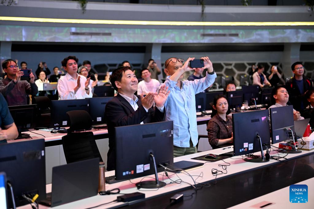 Researchers celebrate the success of an experiment at the control center of the experimental advanced superconducting tokamak (EAST) in Hefei, east China's Anhui Province, April 12, 2023.